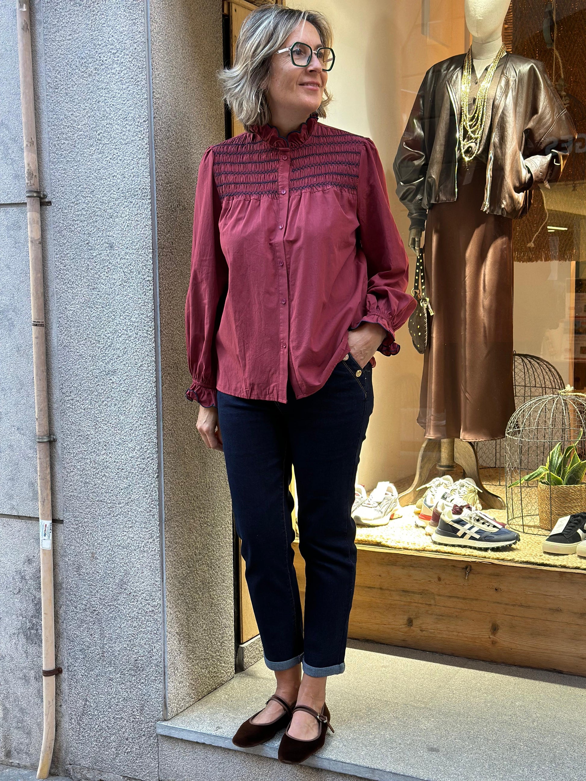 Camisa de color burdeos, amb el detall al coll i als punys de les mànigues.