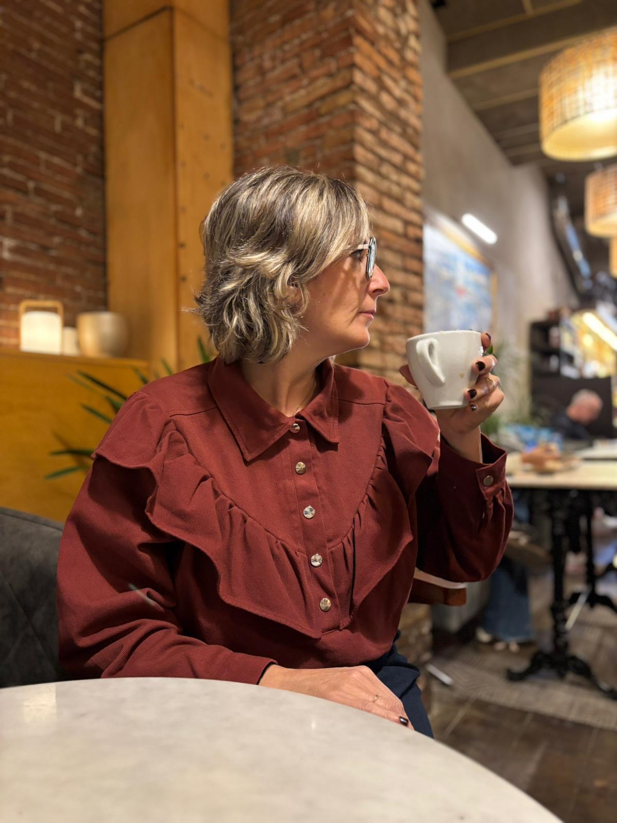 Cmaisa de color burdeos, amb el detall davant, a botonada i coll amb solapes