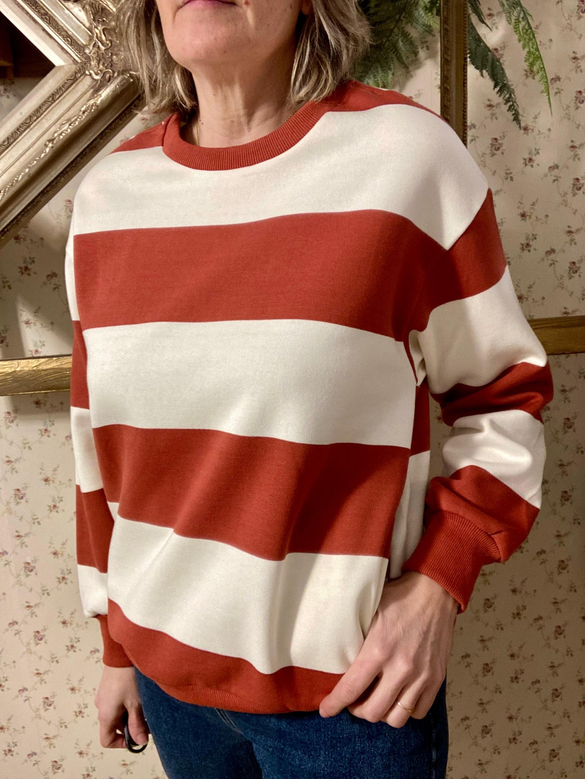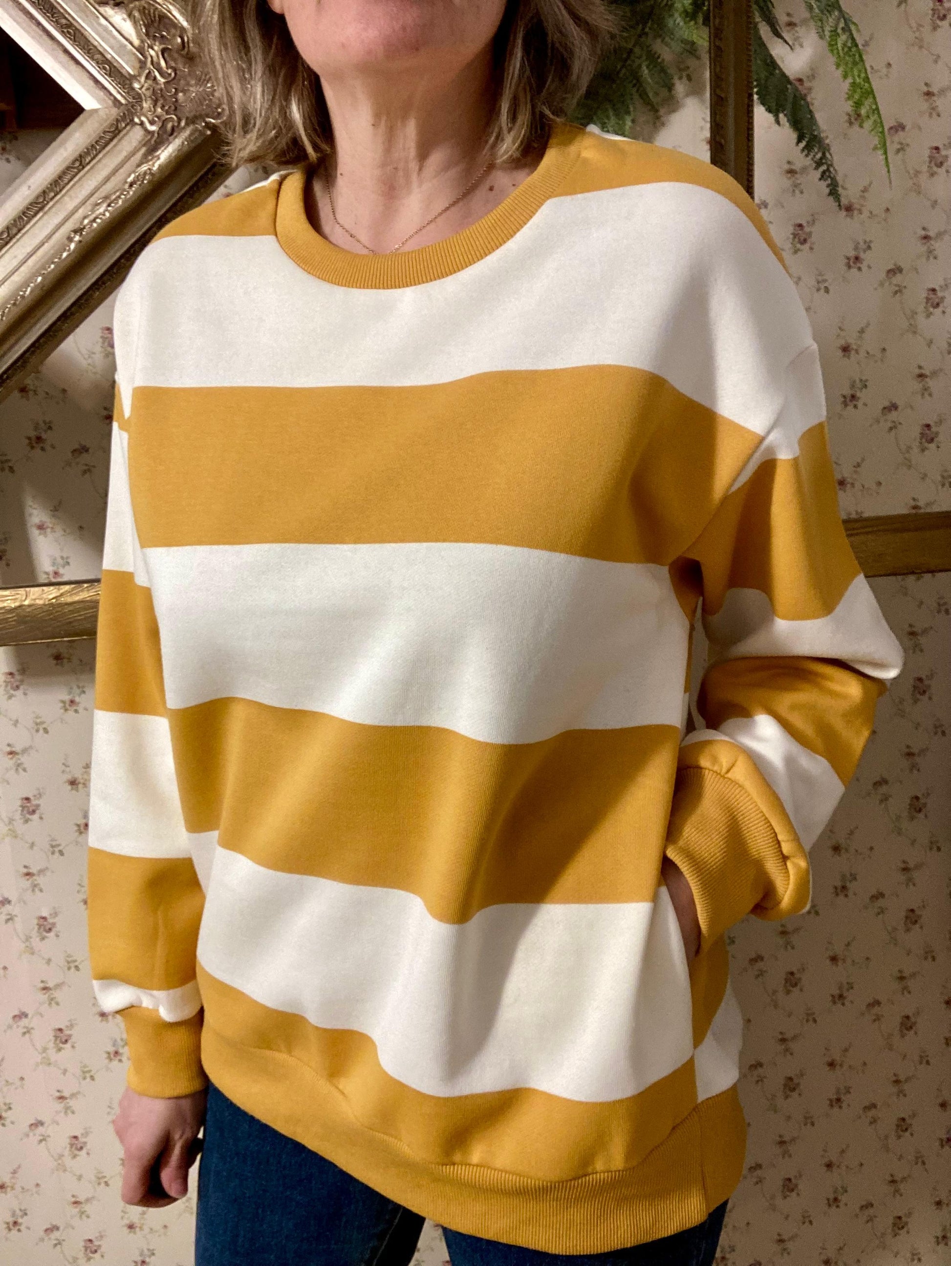 Dessuadora a ratlles amb dos colors disponibles en groc i vermell.
