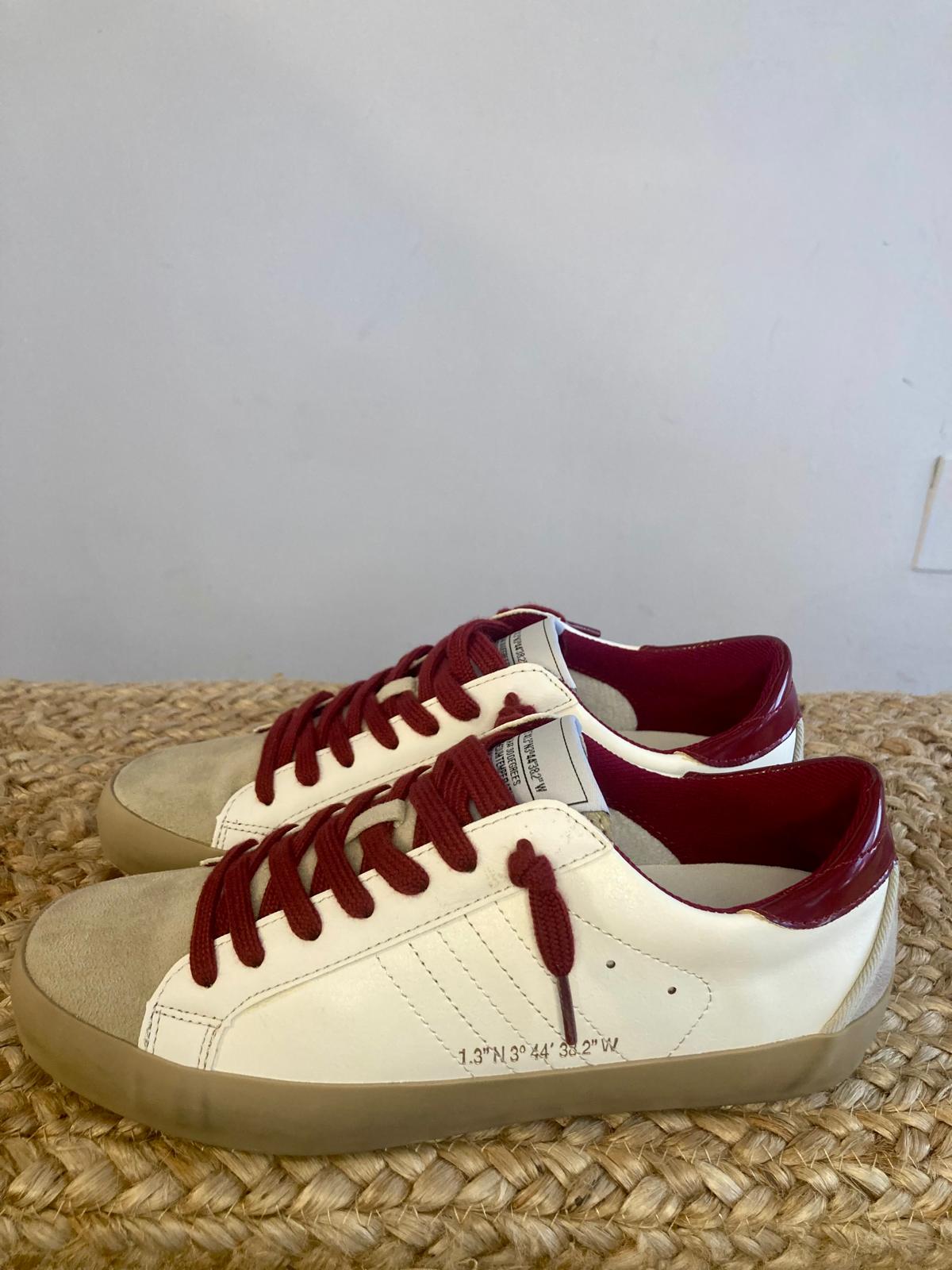Esportiva plana de color blanca amb els detalls en color burdeos. n