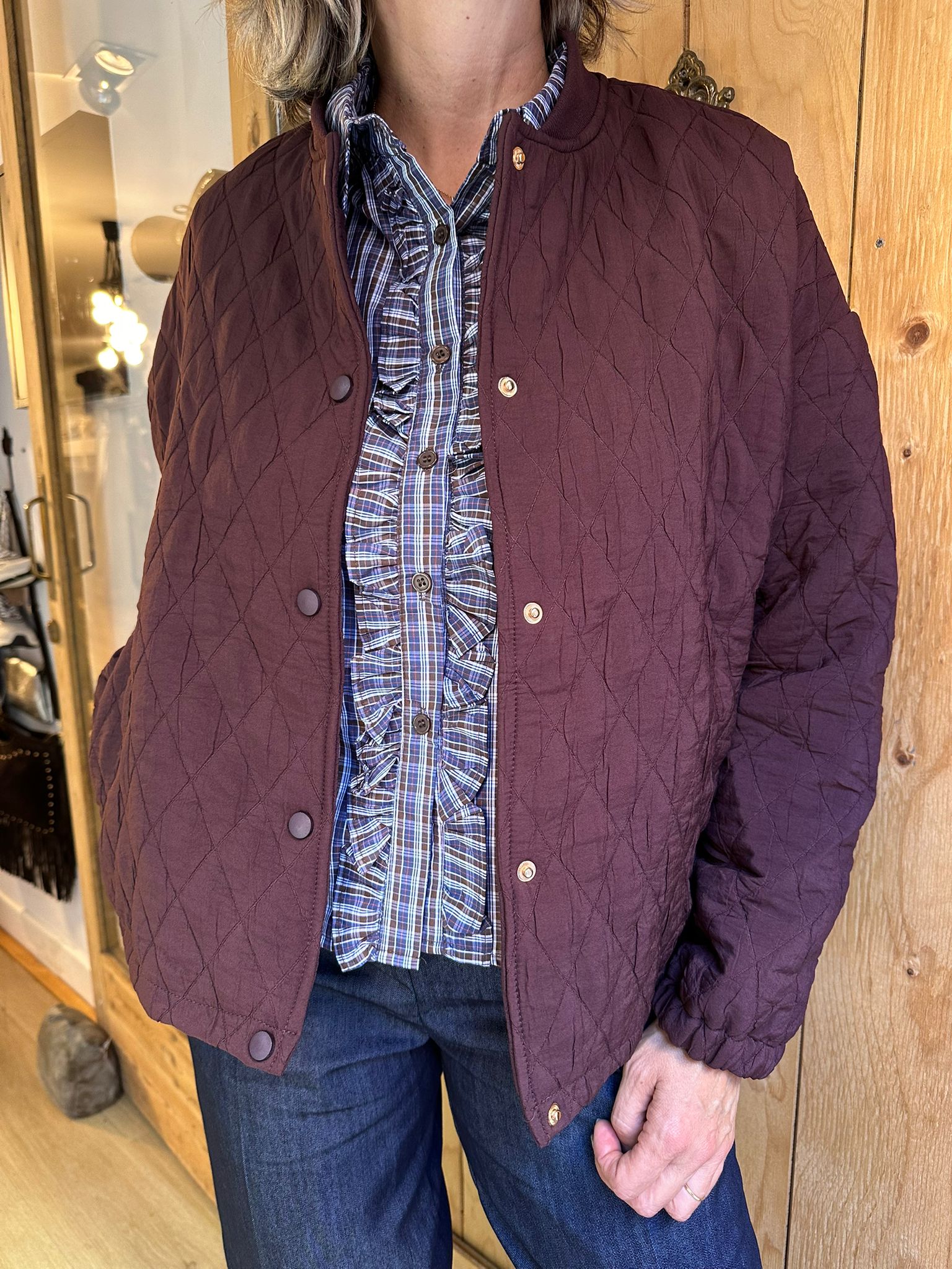 Jaqueta d'estil bomber de color bordeus, a botonada amb butxaques.