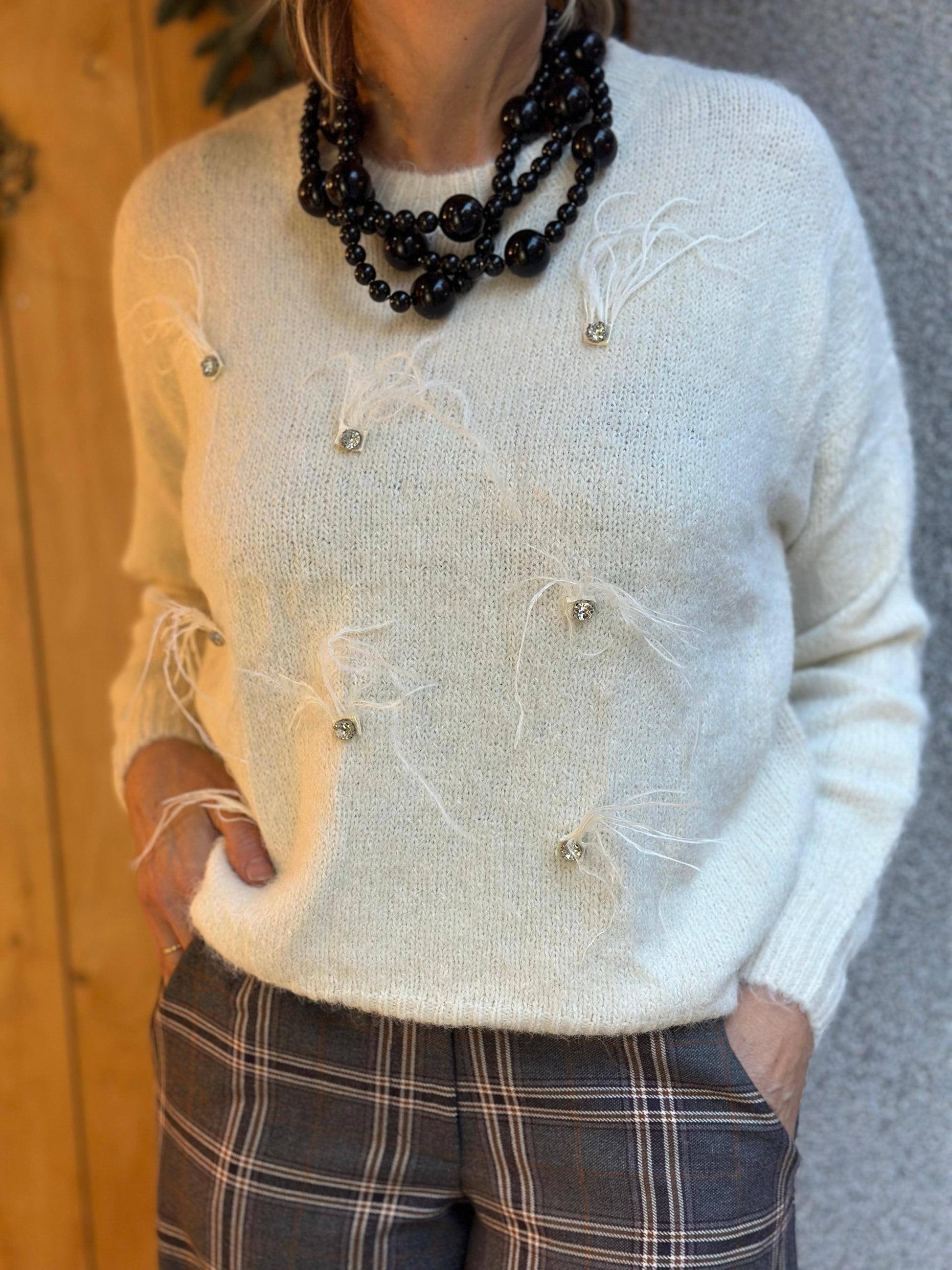 Jersei de color blanc amb el detall al pit amb plomes.