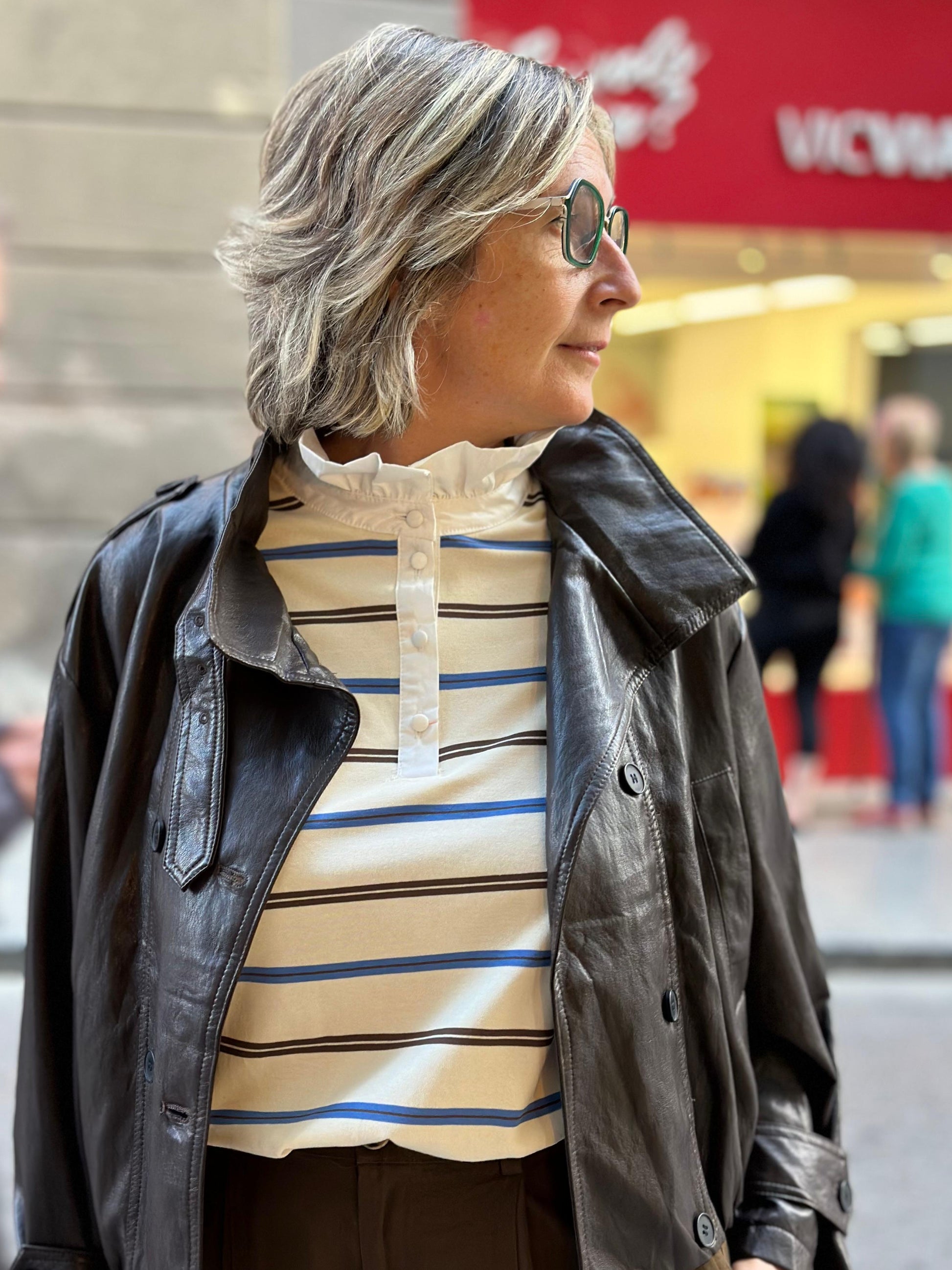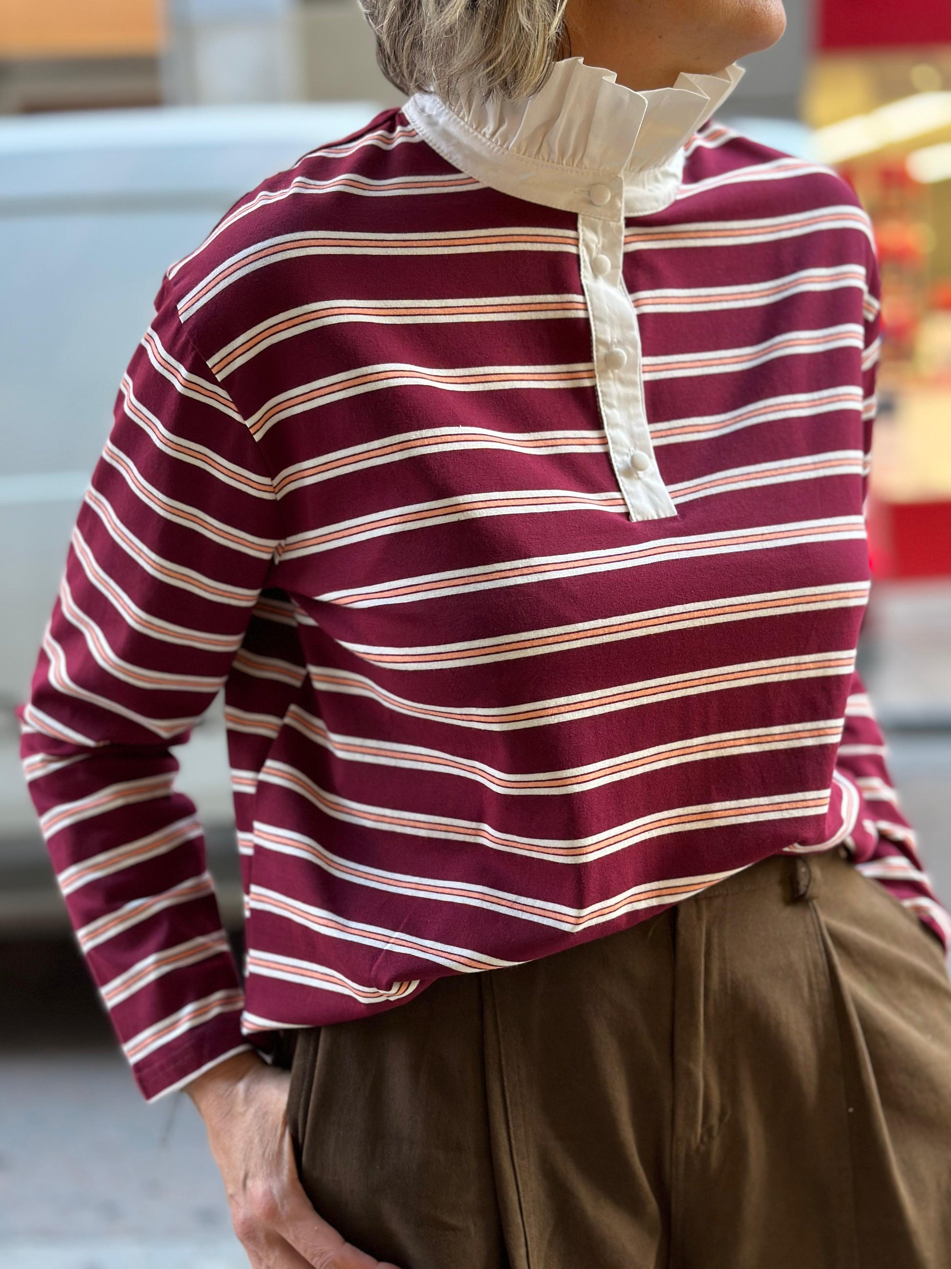 Samarreta màniga llarga, estampada a ratlles amb dos colores blanca i tons blaus, i granat i tons roses.